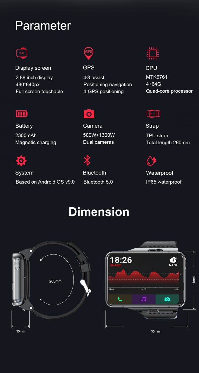 Rainbuvvy S999 4G LTE Smartwatch 4GB RAM 64GB ROM 2.88" Big Screen 5MP/13MP Dual Camera Quad Core 2300mAh Android 9.0 Men Watch